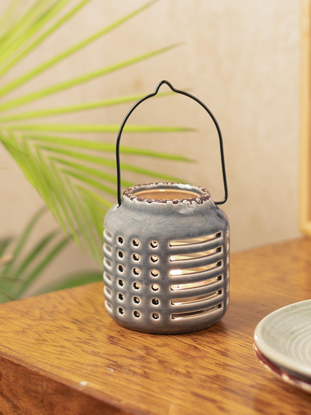 The "Market99 Lantern Lamp, T-Light Candle Holder, Sun Pattern Cutwork, Black Color, Mild Steel" is a beautiful and eco-friendly lighting fixture from Market99. This lantern-style lamp holds T-light candles securely and illuminates any room with a soft glow. Its stunning sun pattern cutwork enables candlelight to create complex patterns, enhancing the atmosphere.