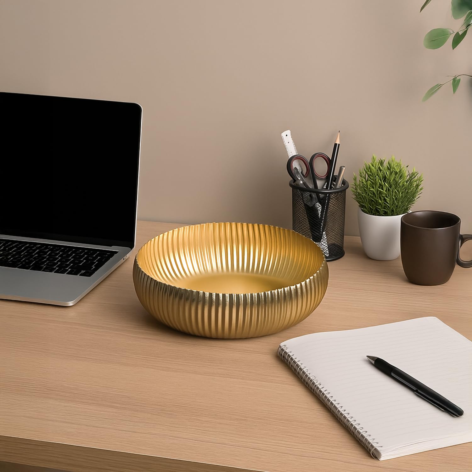 Elevate your centerpiece game with this golden ribbed bowl on a coordinating stand. The lifted profile adds presence, while ribbed detailing reflects ambient light beautifully. Perfect for floral or potpourri displays, it creates dimension on dining tables, consoles, and sideboards. An elegant, ready-to-style piece that looks curated in seconds.