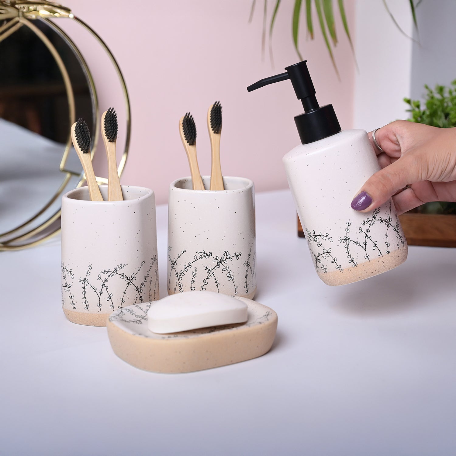 Transform your bathroom with this sophisticated grey ceramic set, featuring a cylindrical soap dispenser, square toothbrush holder, square tumbler, and rectangular soap dish. Each piece harmoniously blends modern design with practical functionality, creating a chic and cohesive look.