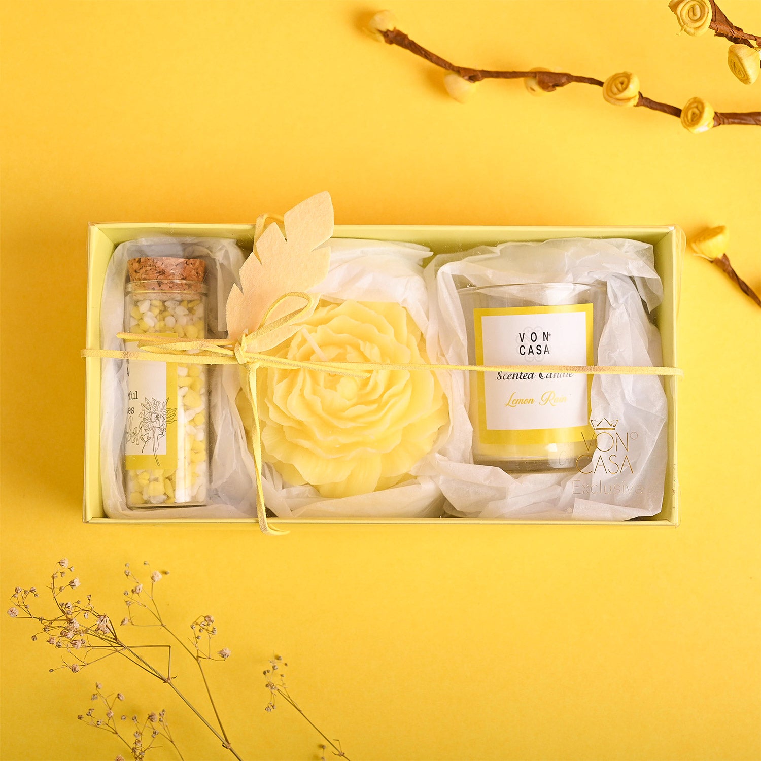 Featuring a wax candle, potpourri, and a flower candle, this gift set comes in a vibrant yellow cylindrical shape. The Lemon Rain fragrance offers a refreshing citrus scent, perfect for energizing any space.