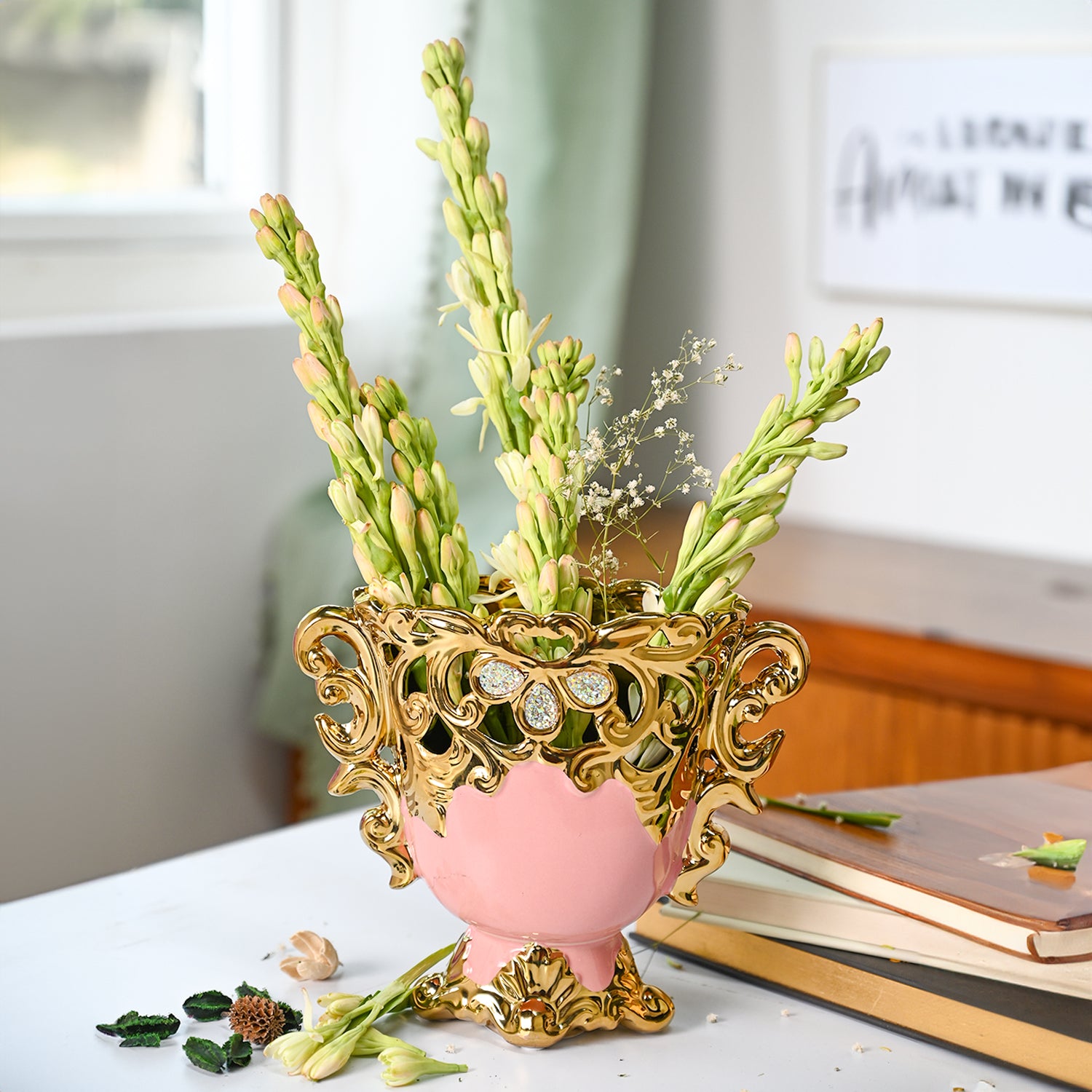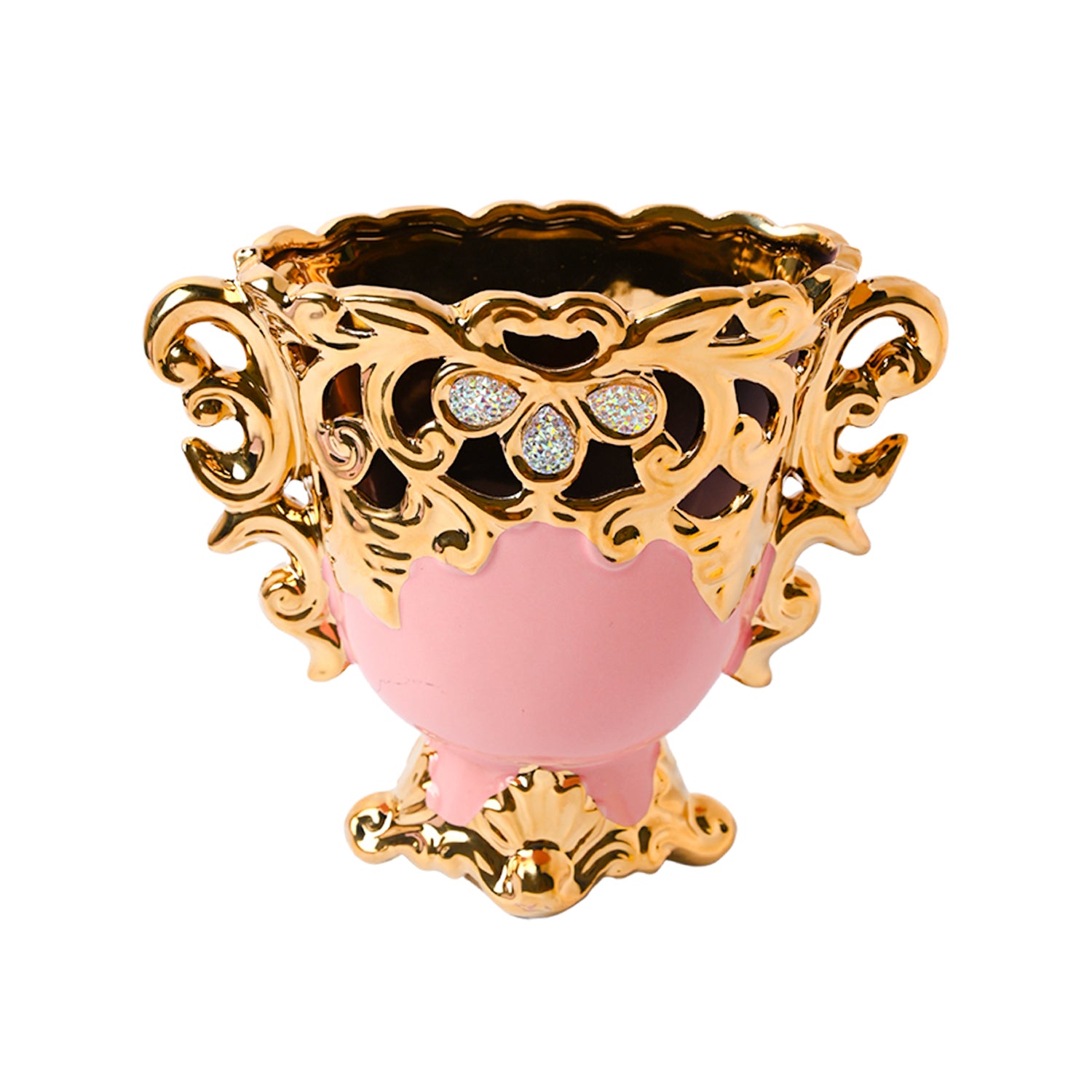 Our Trophy-Shaped Flower Holder enhances your home décor. Elegant porcelain and embellished in golden and pink, this item exudes elegance. Use your favorite flowers to make every day a celebration. It's excellent home décor and the ideal present for any occasion.