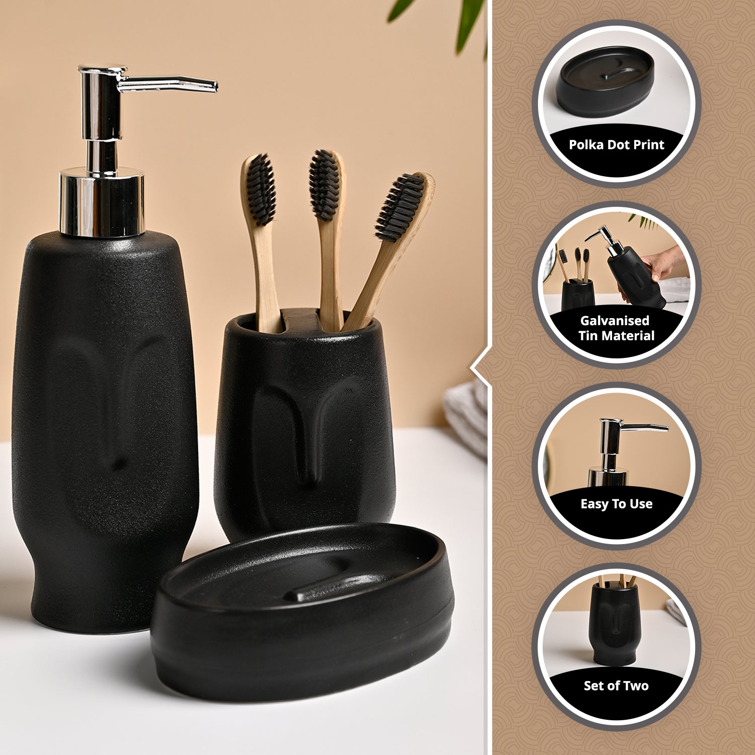 Upgrade your bathroom decor with this sleek black ceramic set. It includes a 380 ml soap dispenser and a matching toothbrush holder. The minimalist design in a timeless black hue ensures these essentials add a touch of elegance and functionality to your bathroom routine.