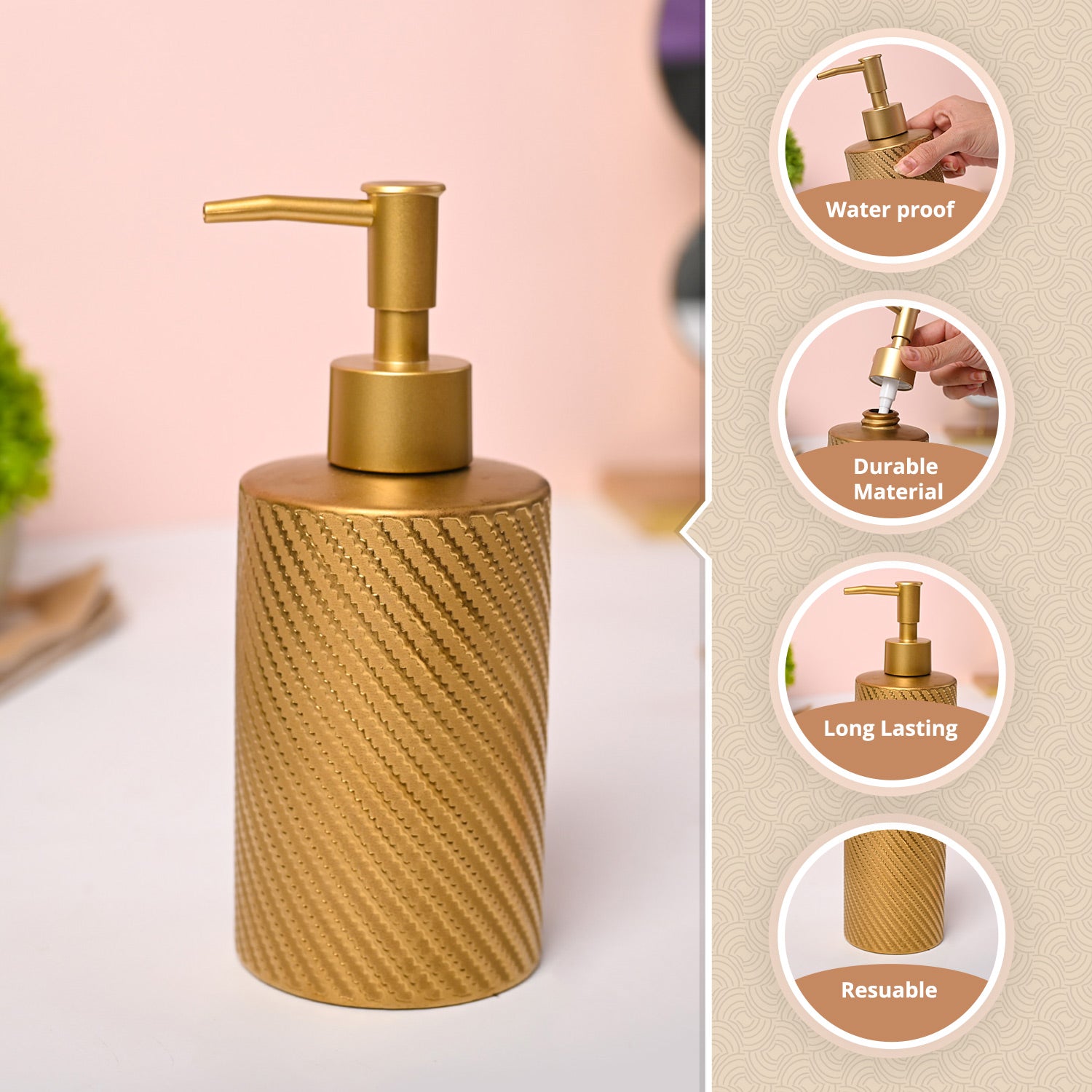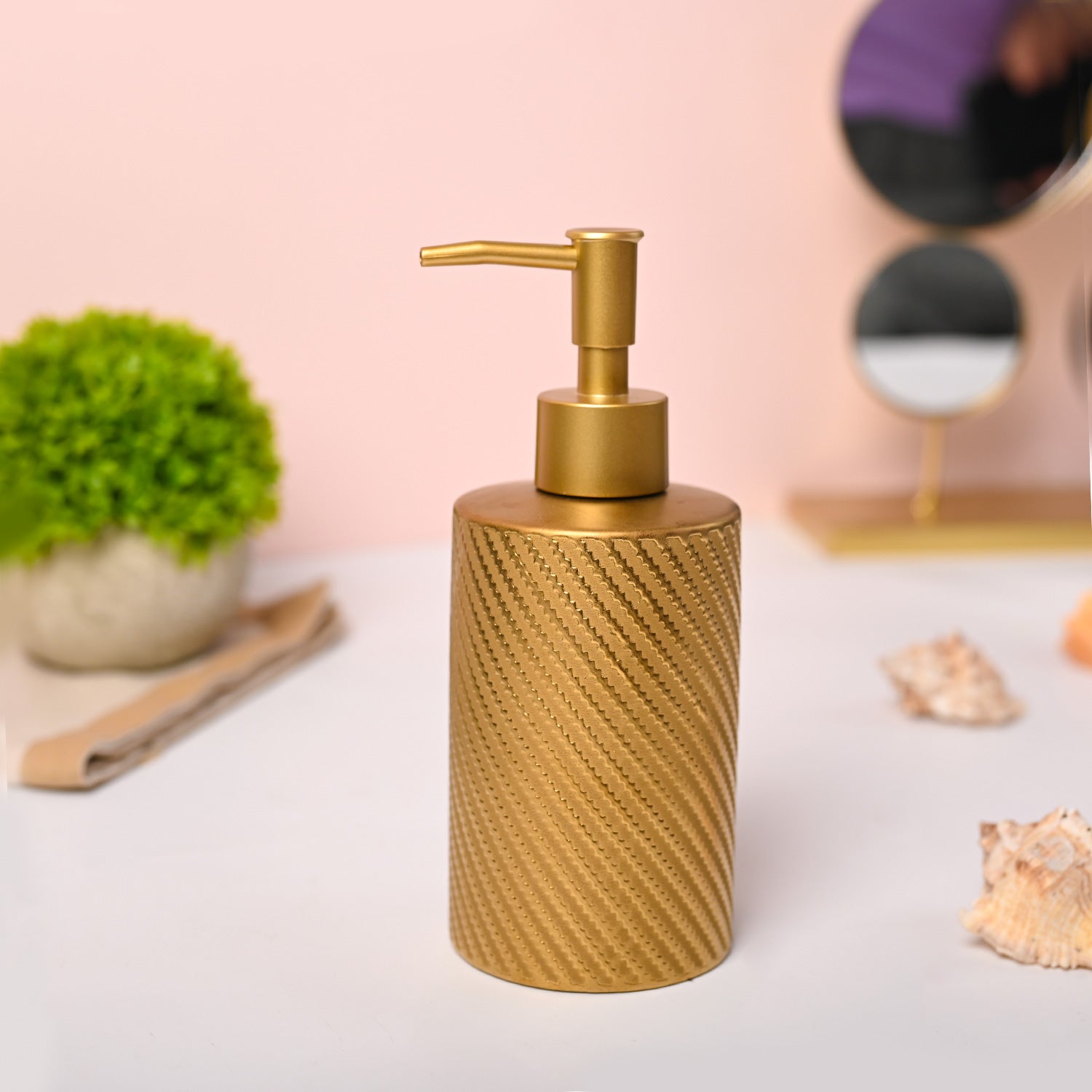 This elegant golden cylindrical soap dispenser boasts a glossy vector finish. Measuring 9x8x17 cm, it's a stylish addition to your bathroom or kitchen setup.