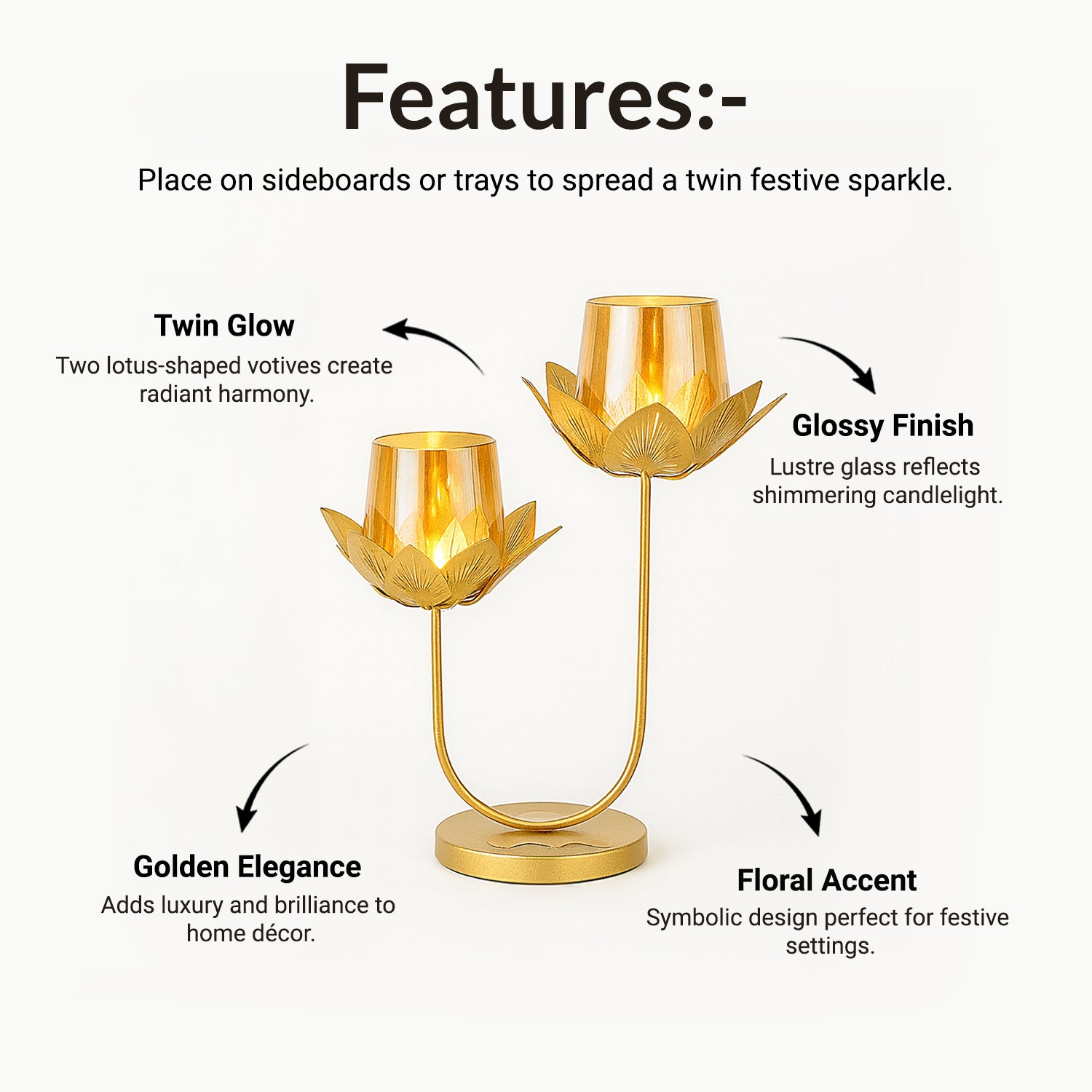 - Includes 2 lotus-shaped votive holders, blending luxury with spiritual charm.