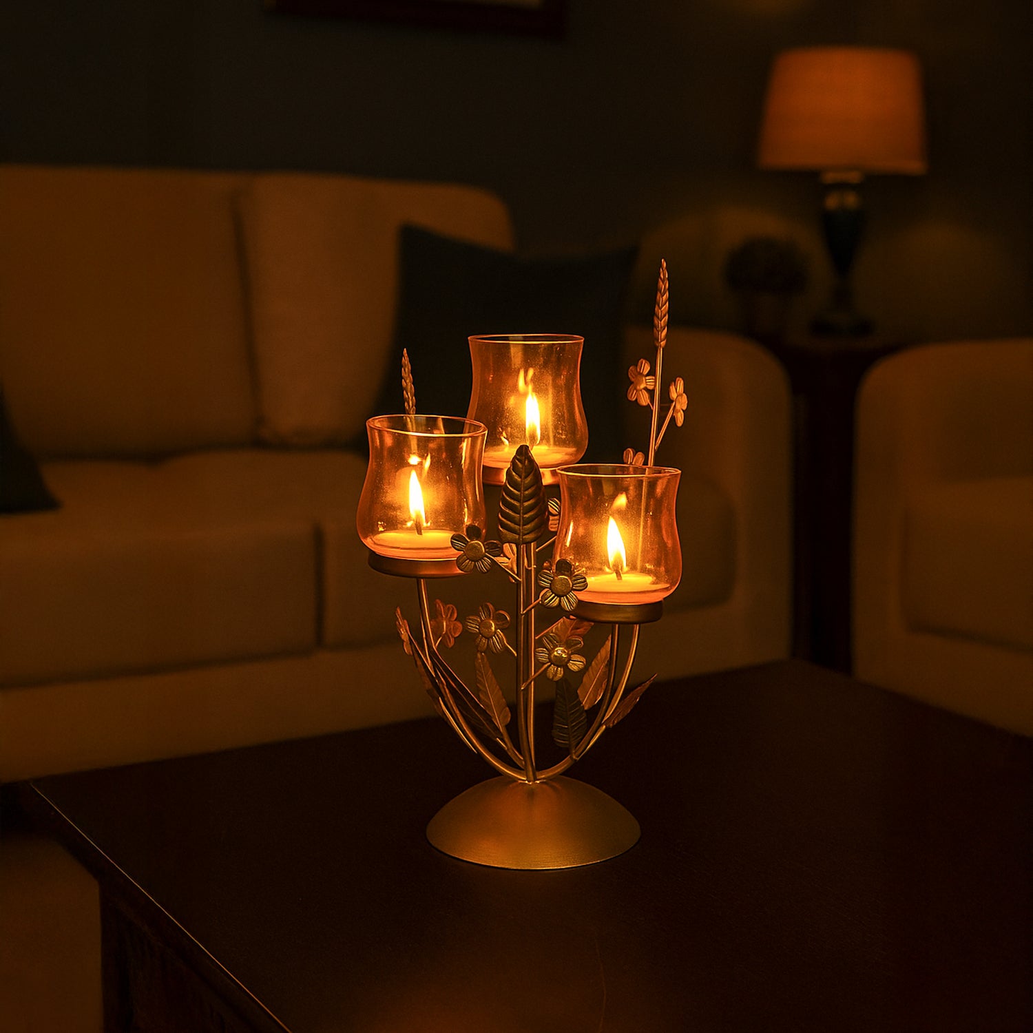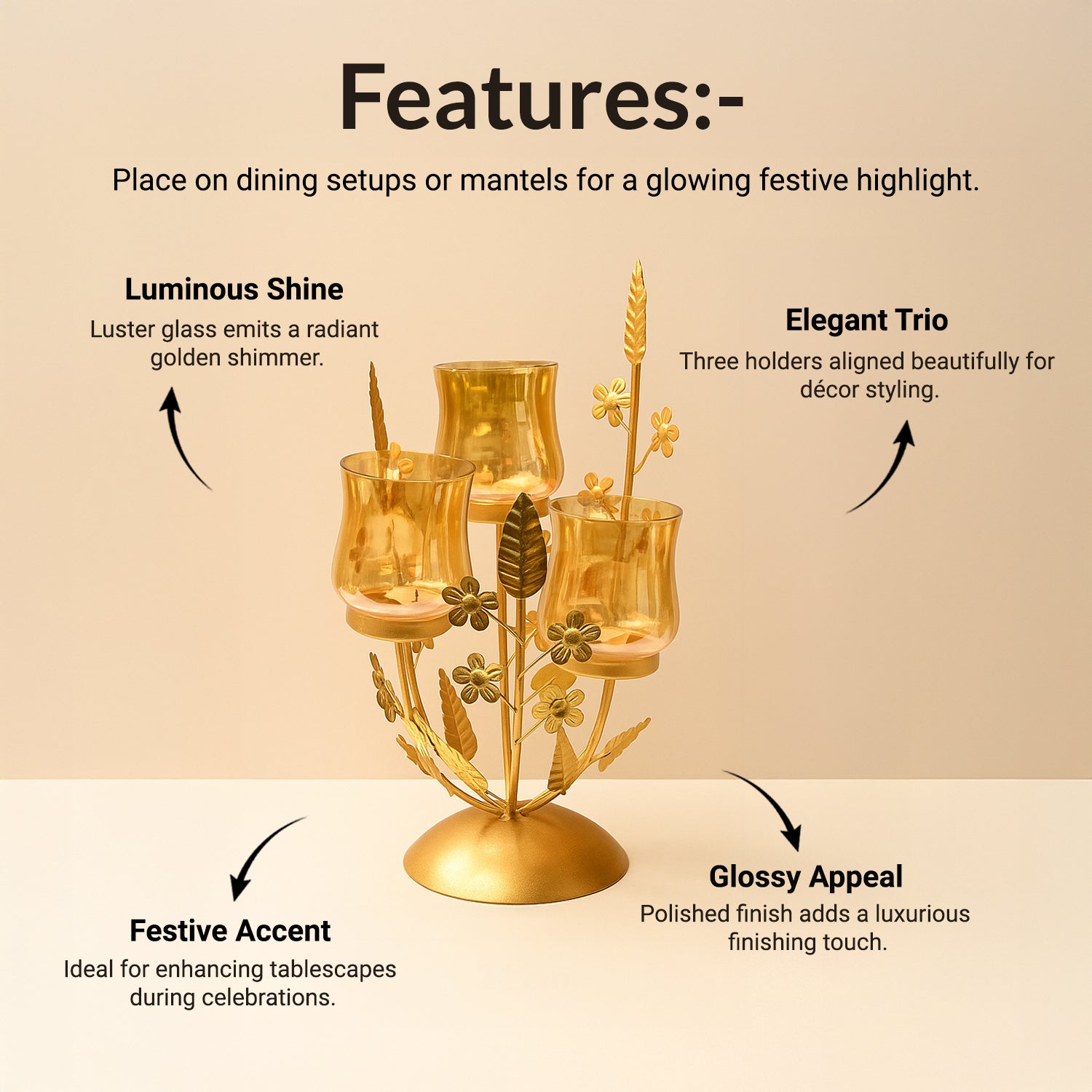 Striking yet elegant, this 3 Votive T-Light Holder a gold metallic base with dazzling golden luster glass votives, creating a stunning visual contrast. The glossy finish ensures a luxurious touch, while the triple votive design spreads warm, inviting light across your space. Ideal for both modern and traditional décor, it works beautifully on dining tables, consoles, or sideboards. Perfect for festive occasions, romantic dinners, or everyday décor, this piece combines bold style with radiant charm, making it a versatile centerpiece for any home.