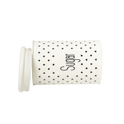 - This sugar dispenser is a stylish addition to any kitchen thanks to its chic white polka dot fabric and modern cylinder form. It may be used to store sugar, but it makes for a lovely decorative piece because of its refined design.
