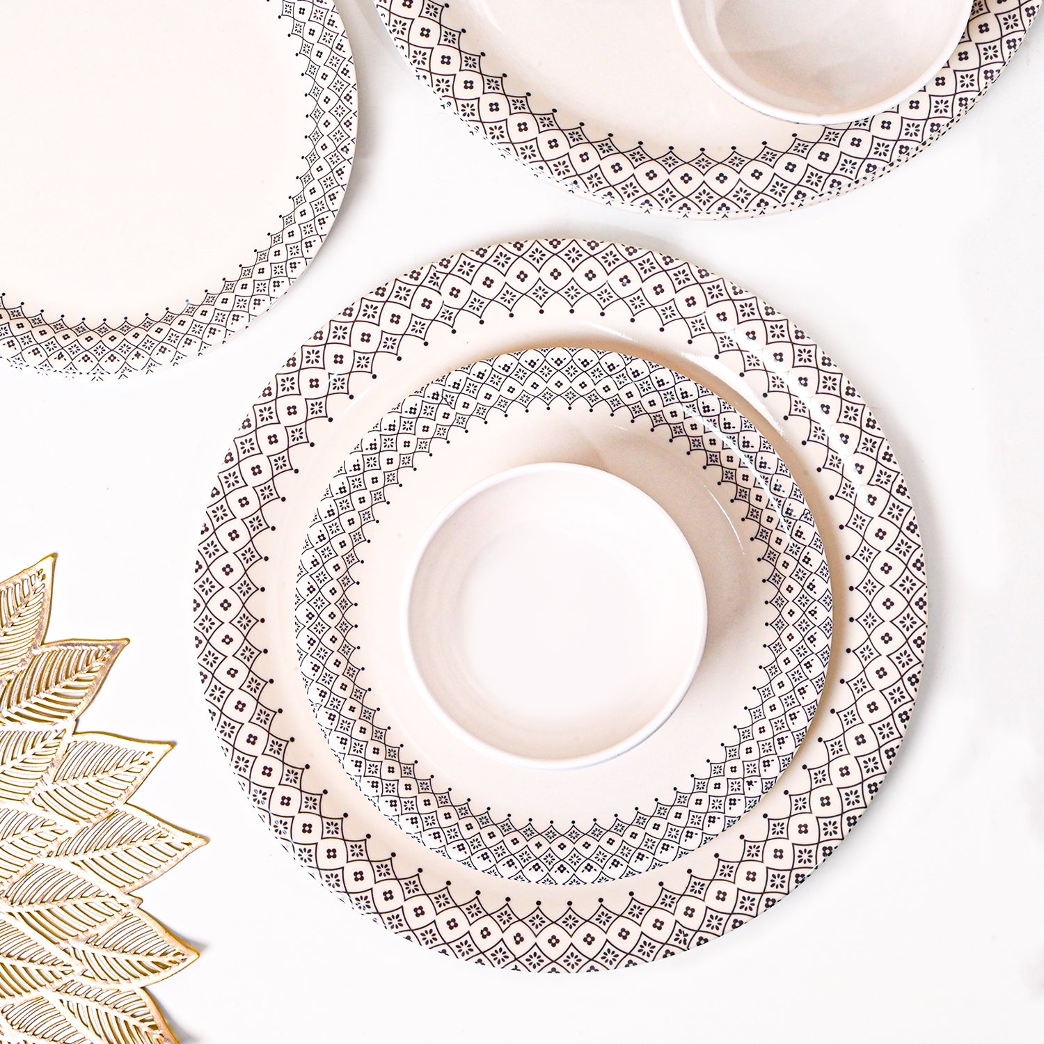 Included in this package are 4 full plates, 4 quarter plates, and 4 soup bowls, each of which holds 280 milliliters. This collection, which takes its inspiration from Moroccan design, includes a glossy hammered pattern in white. Made from melamine and painted with paint that is safe for food, and adds a touch of luxury to your eating experience.
