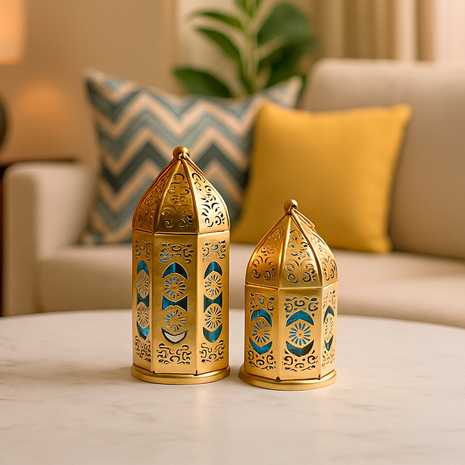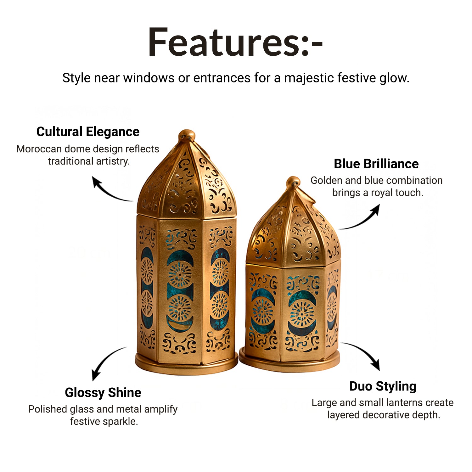 Moroccan Lantern Set of 2 – Golden & Blue (Domed Design)