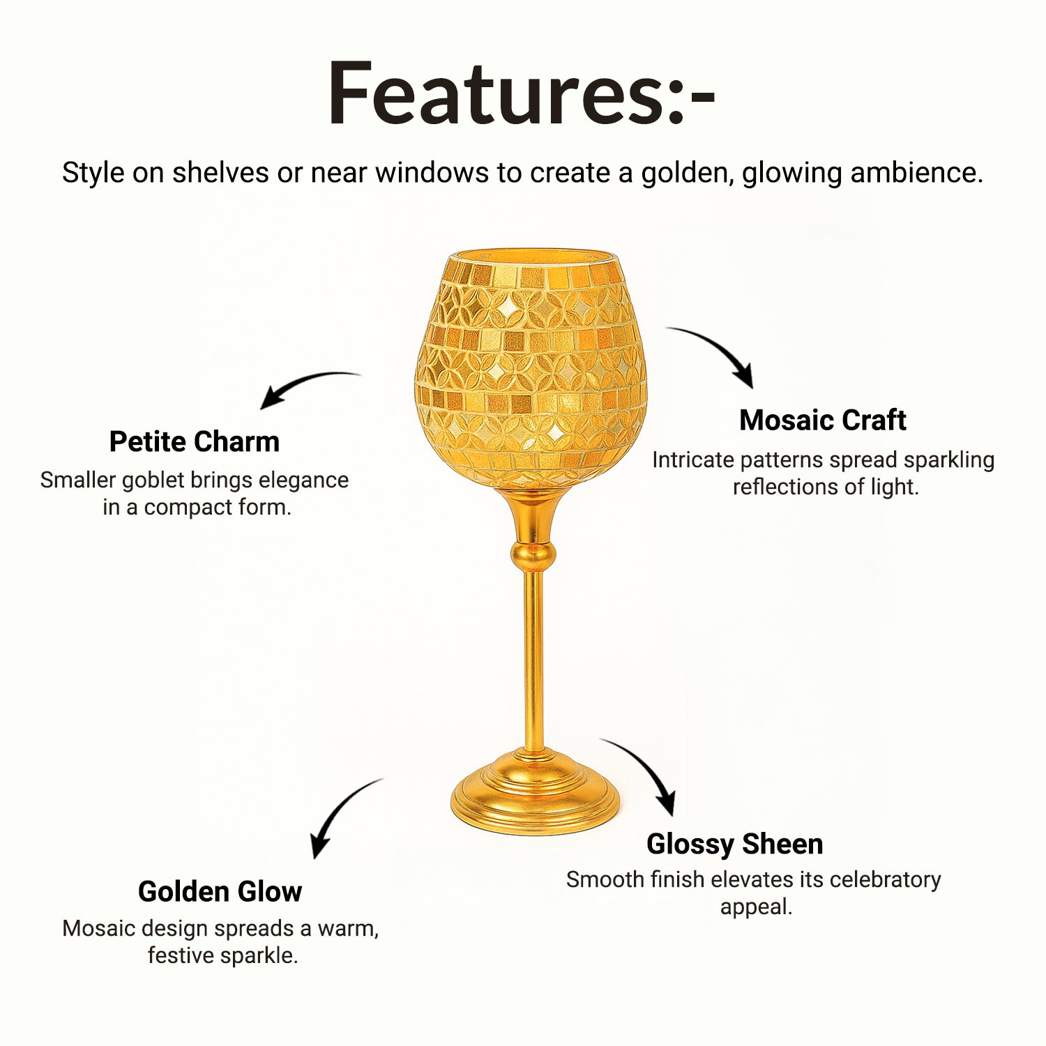 Beautifully crafted in a stem glass design, this small golden Goblet T-Light Holder exudes sophistication in a compact form. The mosaic detailing enhances its glossy golden finish, allowing candlelight to shine through with a radiant glow. Ideal for clustered arrangements, side tables, or as a decorative accent, it pairs perfectly with the larger goblet for a coordinated look. Its rich golden hue makes it a festive favorite, while the intricate design adds a touch of artistry. A versatile décor accessory to