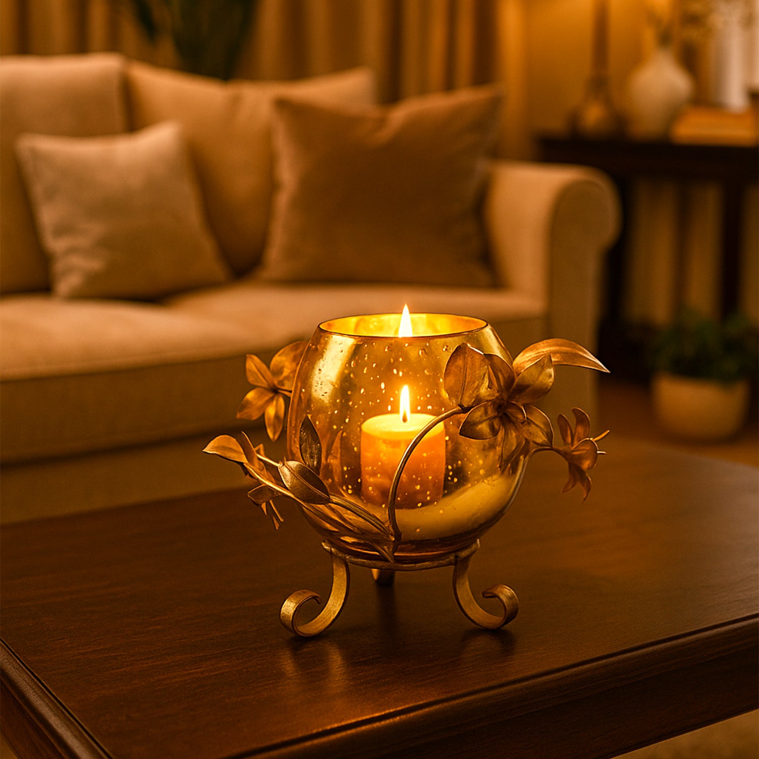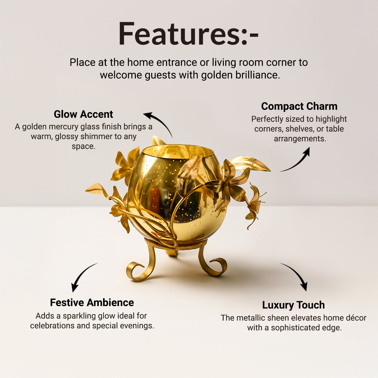 Illuminate your home with this Golden Sphere T-Light Holder, crafted from metal and mercury glass for an elegant touch. The glossy finish and intricate design create a soft, glowing radiance when lit, making it ideal for festive evenings or cozy décor. Its compact spherical shape allows easy placement on tables, shelves, or mantles, while the golden hue enhances any setting with warmth and sophistication. Perfect for both modern and traditional interiors, this piece doubles as a décor accent and a charming gift option.