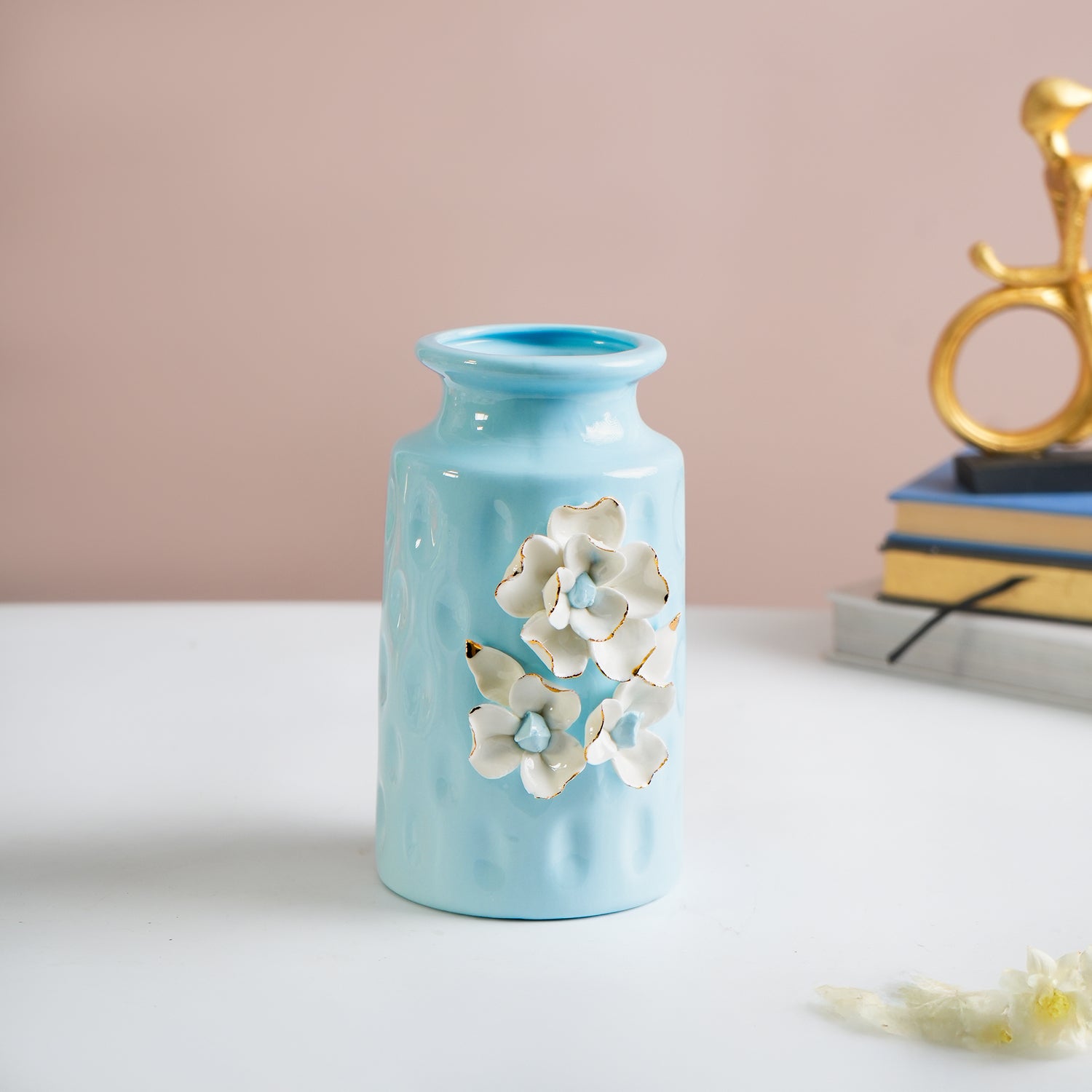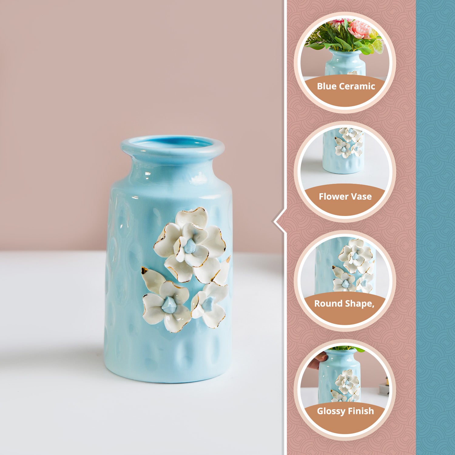Sky Blue Ceramic Flower Vase – Round Shape, Floral Appliques Design, Glossy Finish