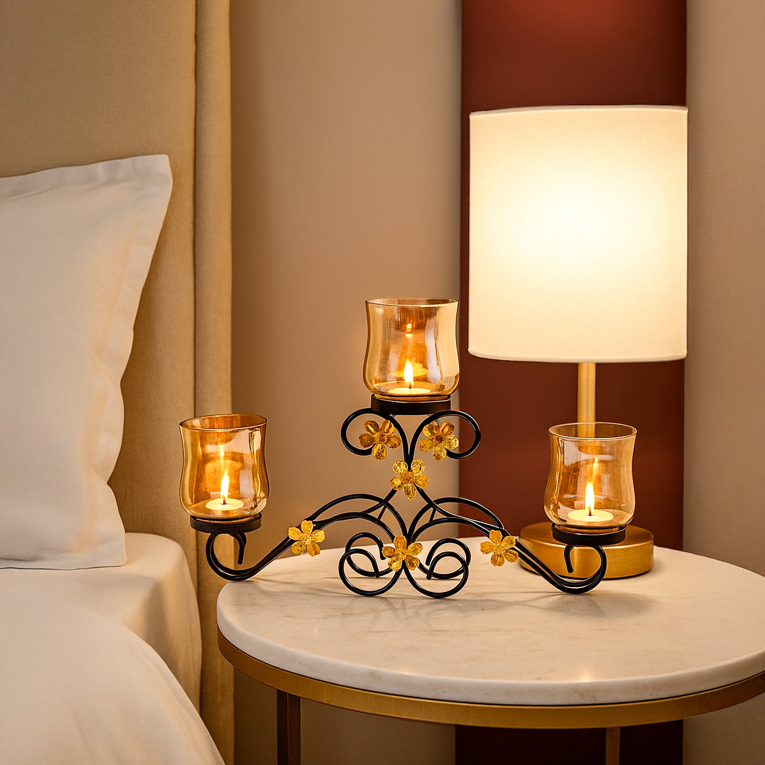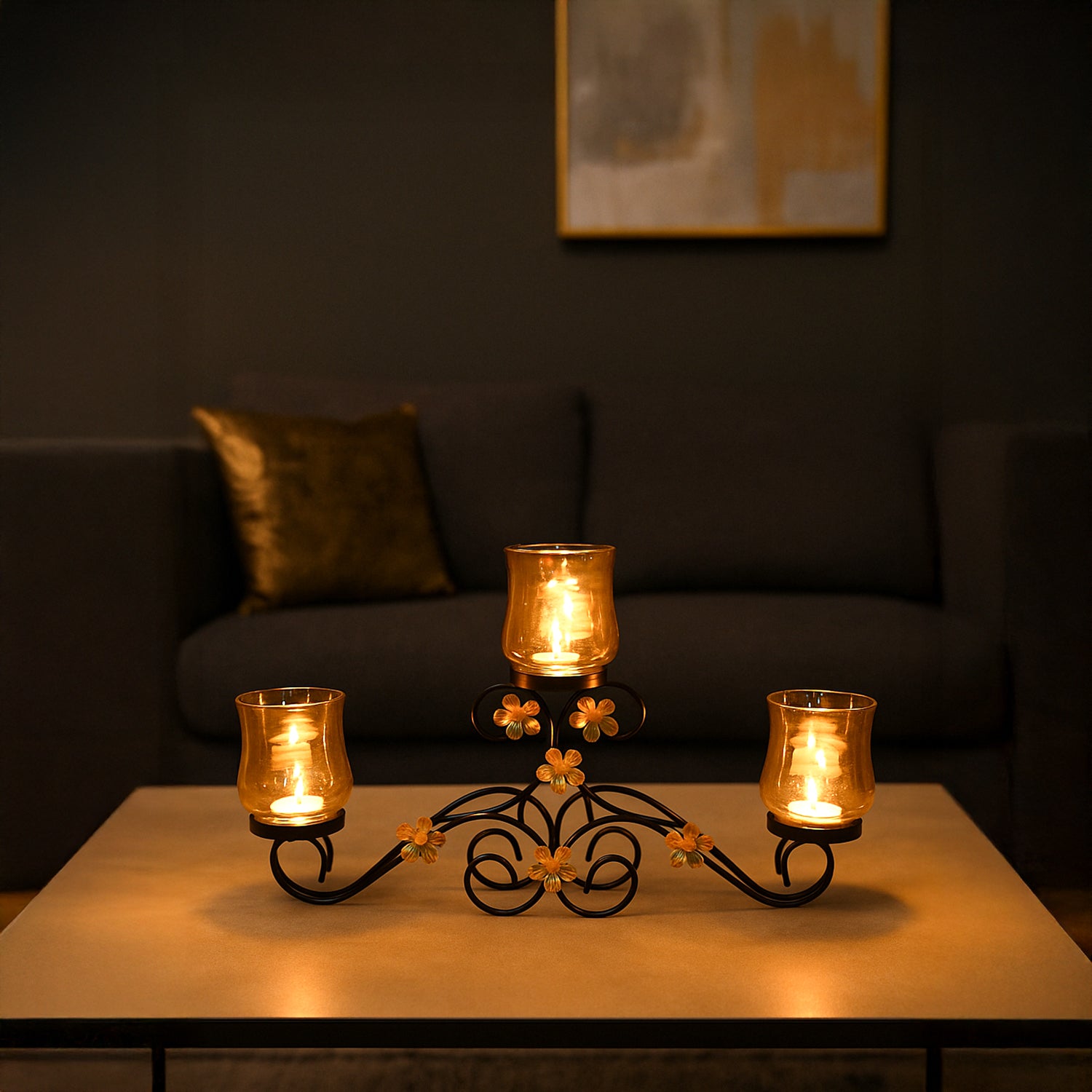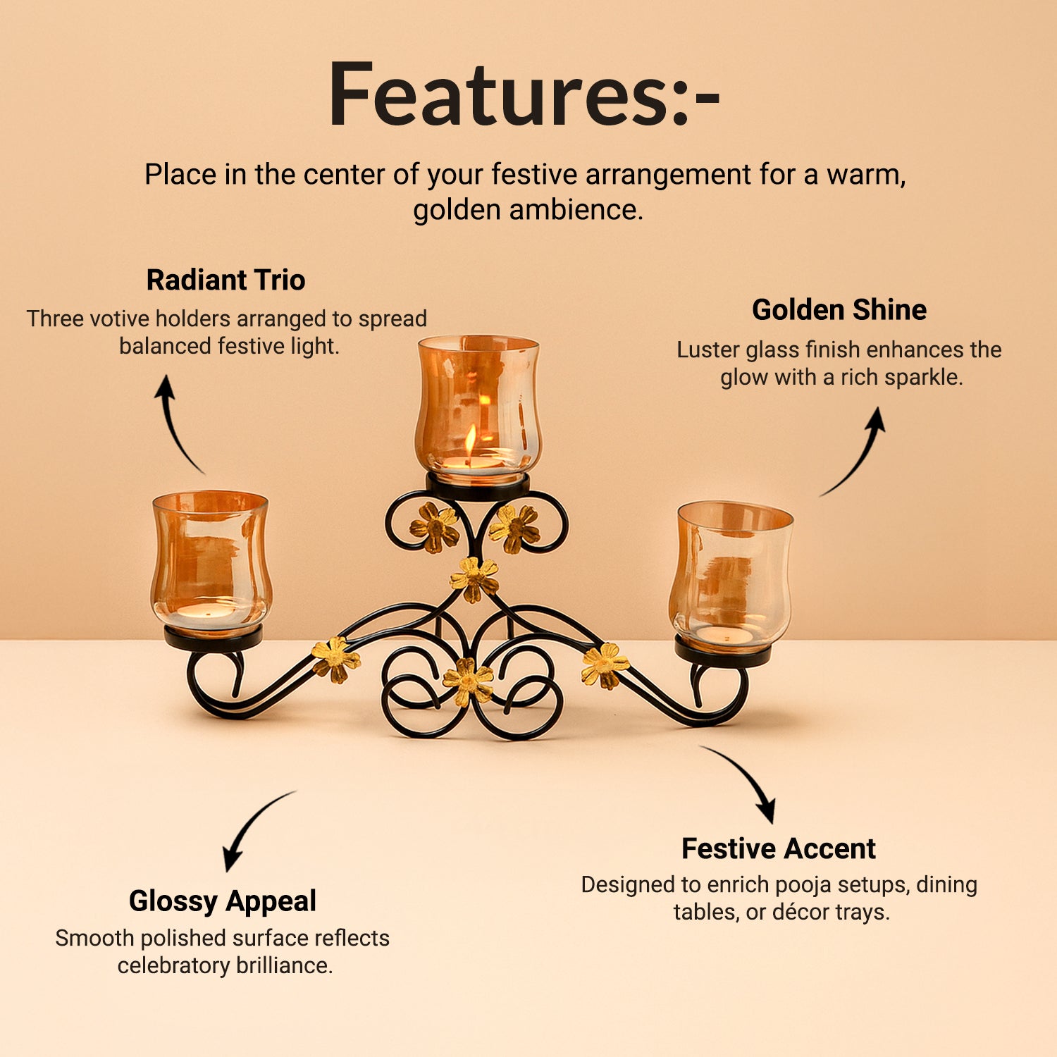 Bring modern sophistication to your space with this 3 Votive T-Light Holder in Chic Black luster glass. Designed with a sleek metal frame, it features three luminous votives that reflect a glossy finish and vibrant glow. Perfect for special occasions like weddings, Diwali, or evening get-togethers, it adds a festive sparkle to your décor. Whether placed on dining tables, consoles, or as a centerpiece, this holder enhances the ambiance with a Chic Black. Stylish, versatile, and elegant, it’s a must-have accent for refined interiors.