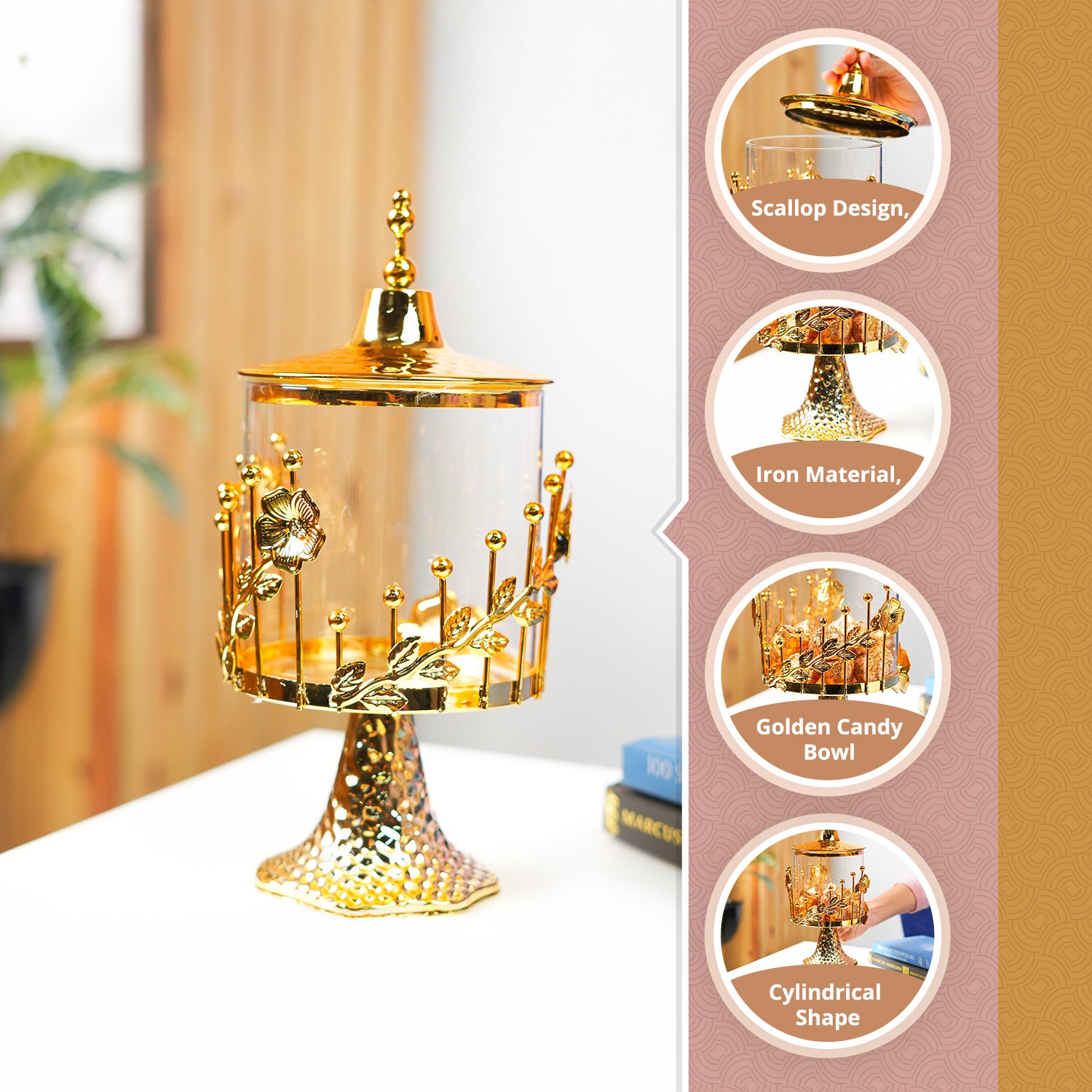 Cylindrical Golden Candy Bowl – Iron Material, Scallop Design, Glossy Finish