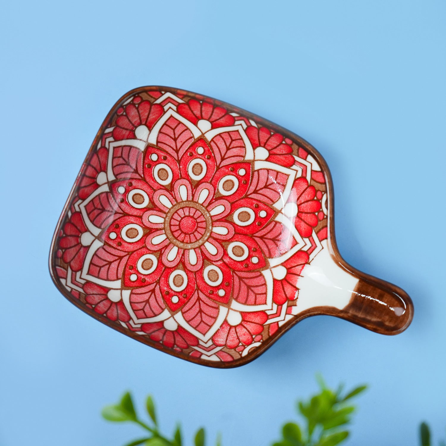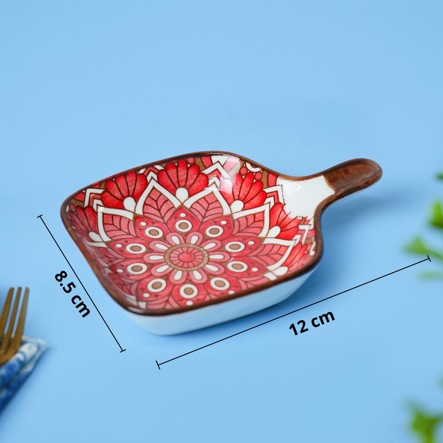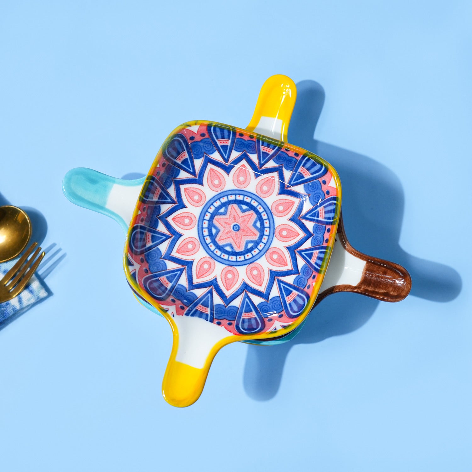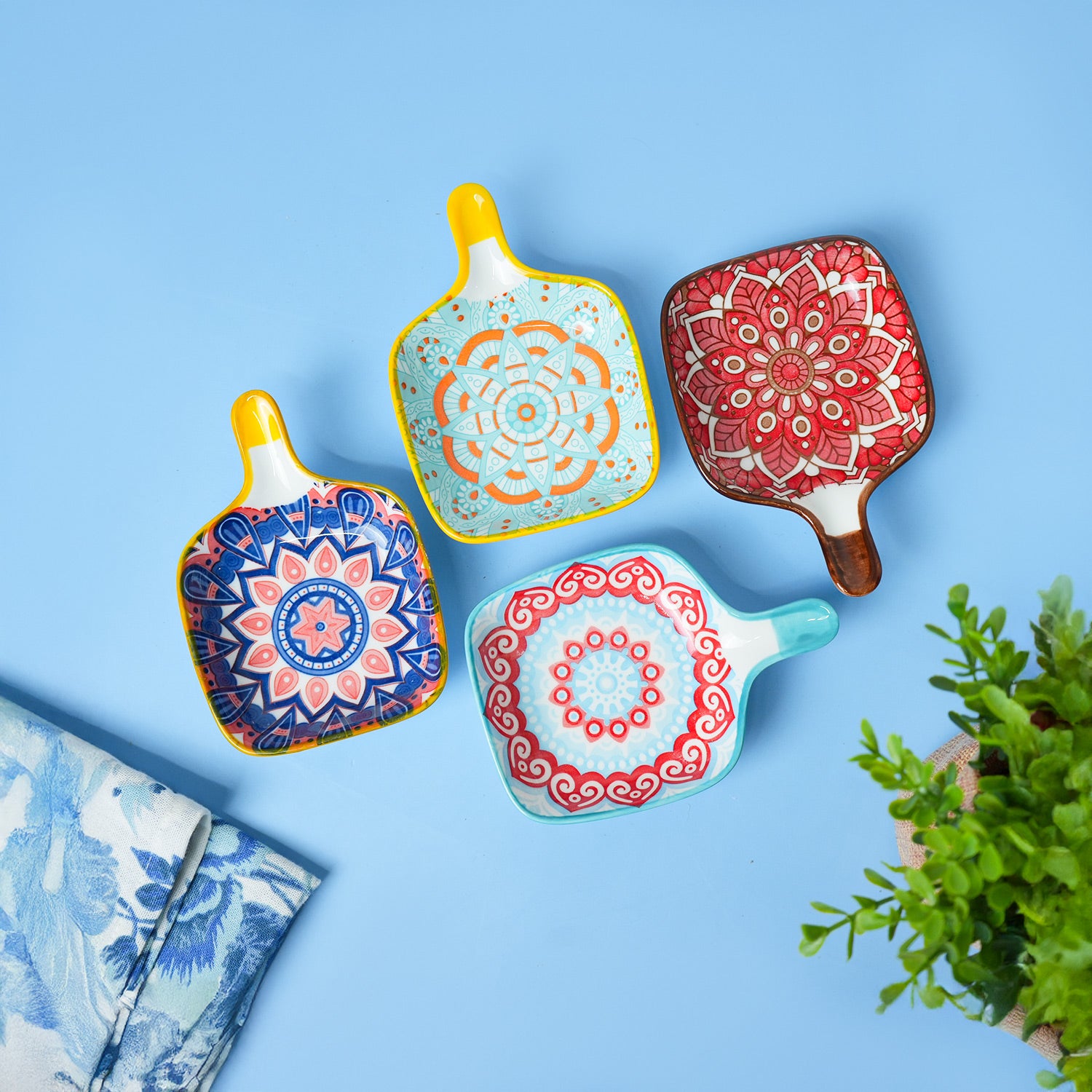 Add vibrance to your dining experience with this set of 4 chutney bowls. Crafted from premium ceramic material, each bowl comes in a rectangular shape with a beautiful mandala print, finished in a glossy glaze that enhances its charm. These multicolour bowls are ideal for serving chutneys, sauces, dips, or condiments in style, ensuring a lively and festive table setup. Compact and lightweight, they are not only practical but also highly decorative, making them perfect for everyday use or entertaining guests. Their unique design adds a pop of colour and cultural artistry, turning simple meals into a visually delightful experience.