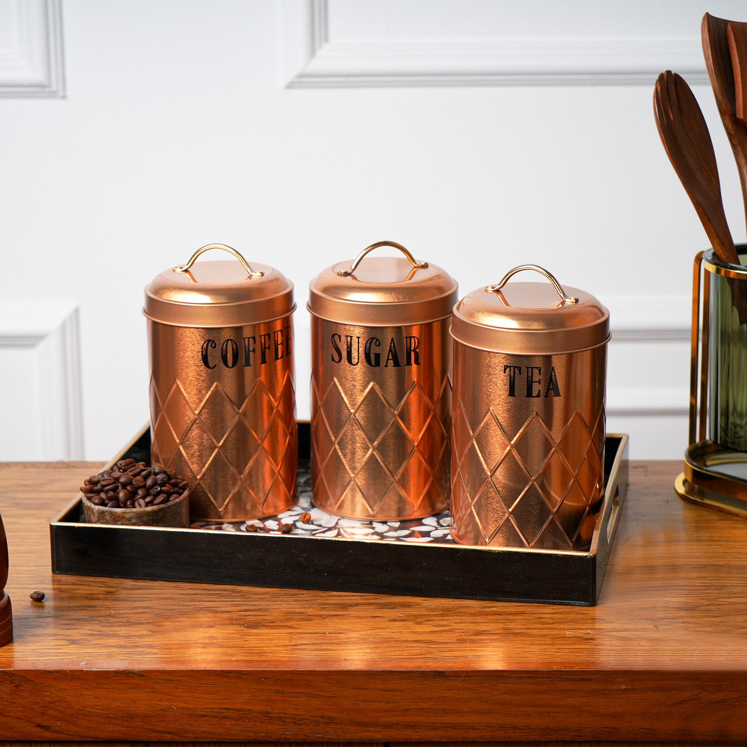 Coffee, Tea & Sugar Jars (Set of 3) – 1000 ml, Golden, Tin Material, Diamond Design Print, Glossy Finish