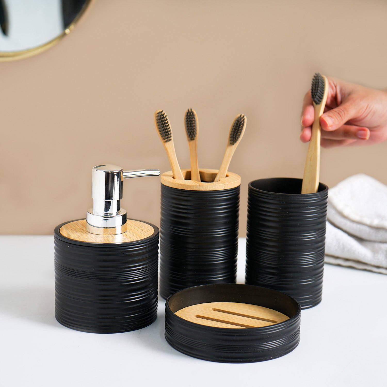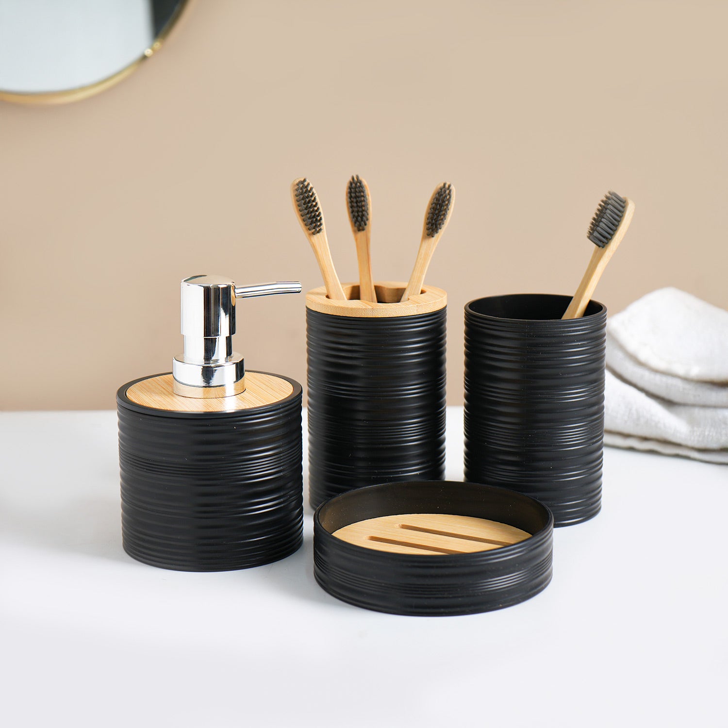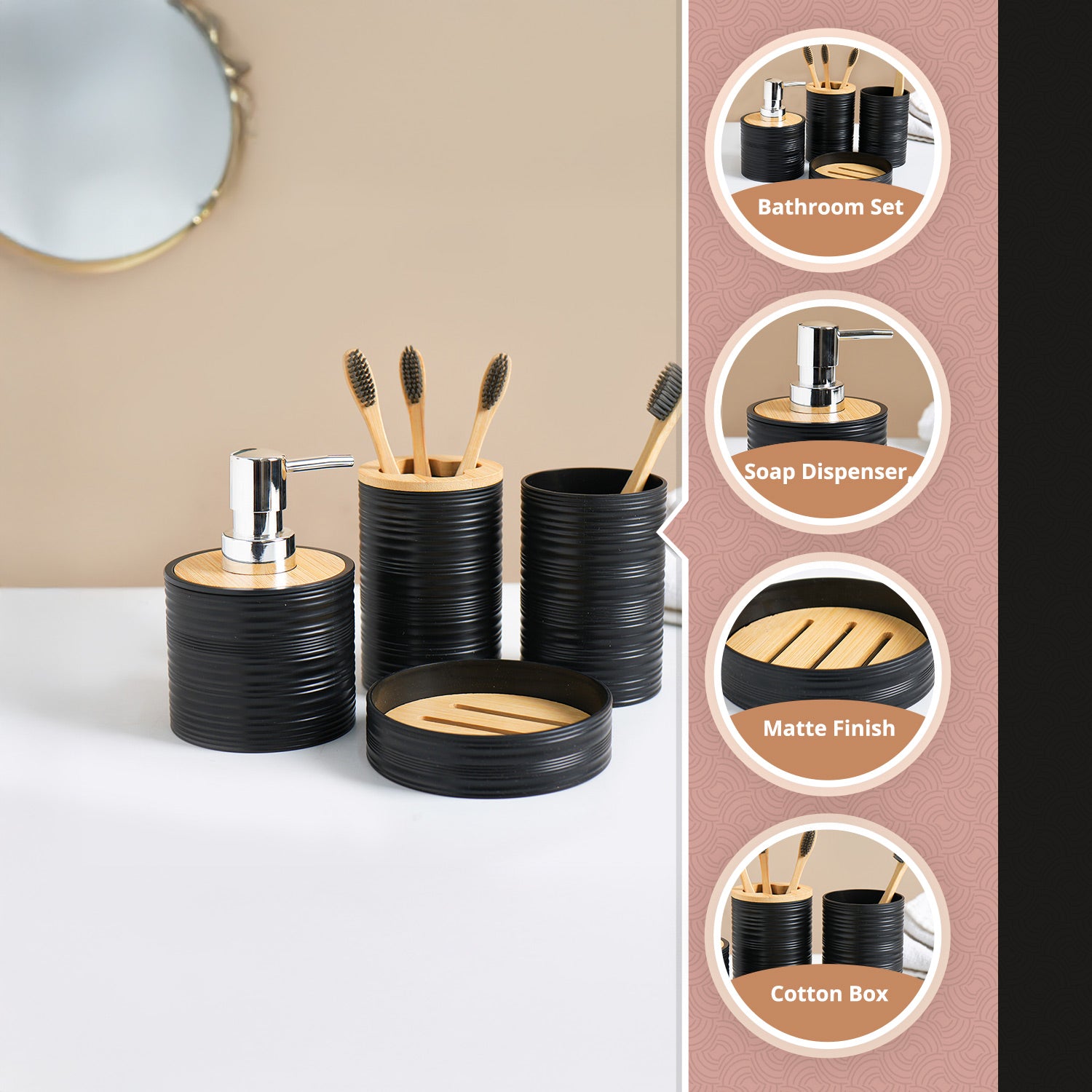 - 4-PIECE COMPLETE SET: Includes soap dispenser (360 ml), cotton box, toothbrush holder, and soap dish for coordinated organization.