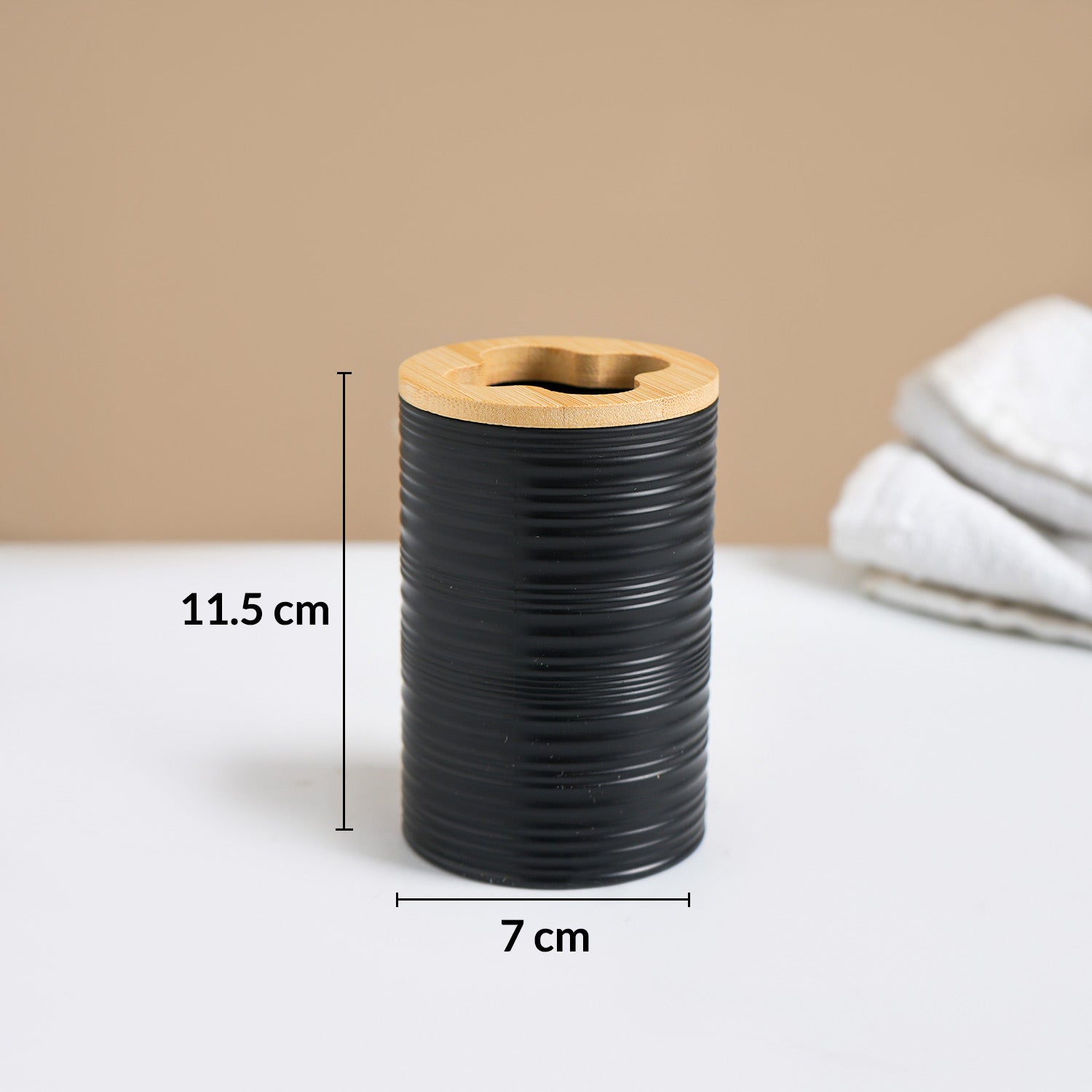 Bathroom Set – Soap Dispenser, Cotton Box, Toothbrush Holder & Soap Dish (Plastic + Bamboo, White, Matte Finish)