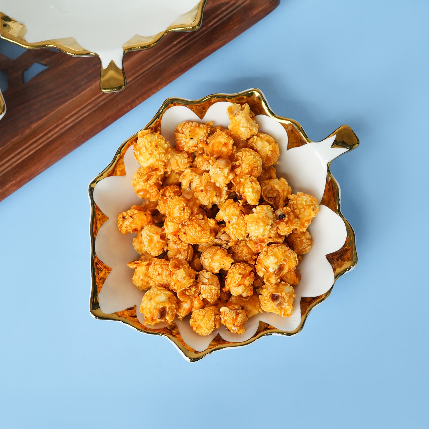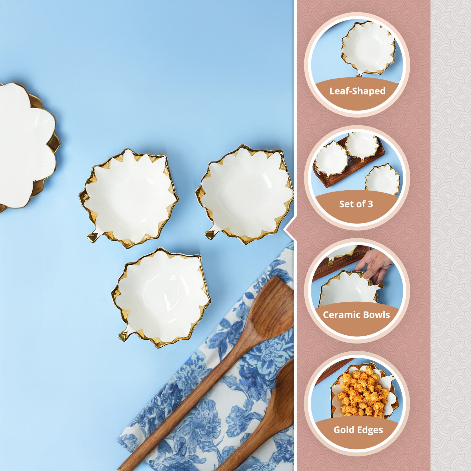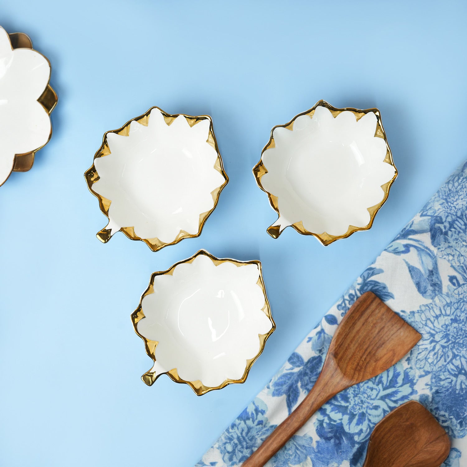 This variant set of three Leaf- Shaped ceramic bowls carries the same timeless appeal of white ceramic with golden borders and a scalloped edge design. The glossy finish enhances its luxurious charm, making it suitable for festive spreads, family dinners, or stylish everyday use. Ideal for serving dry fruits, sweets, or dips, these bowls are versatile and practical. They can be displayed together as a coordinated set or used separately across different settings. Their durability ensures long-lasting use, while the refined design makes them a thoughtful gifting option. An elegant addition that enhances both dining and décor.