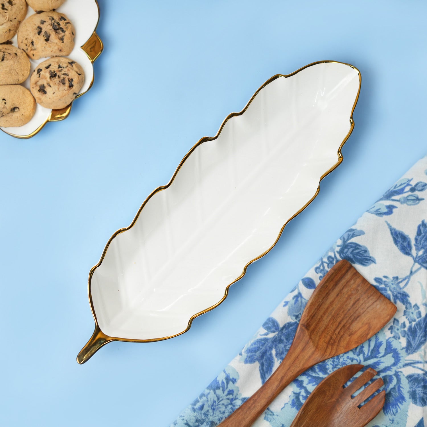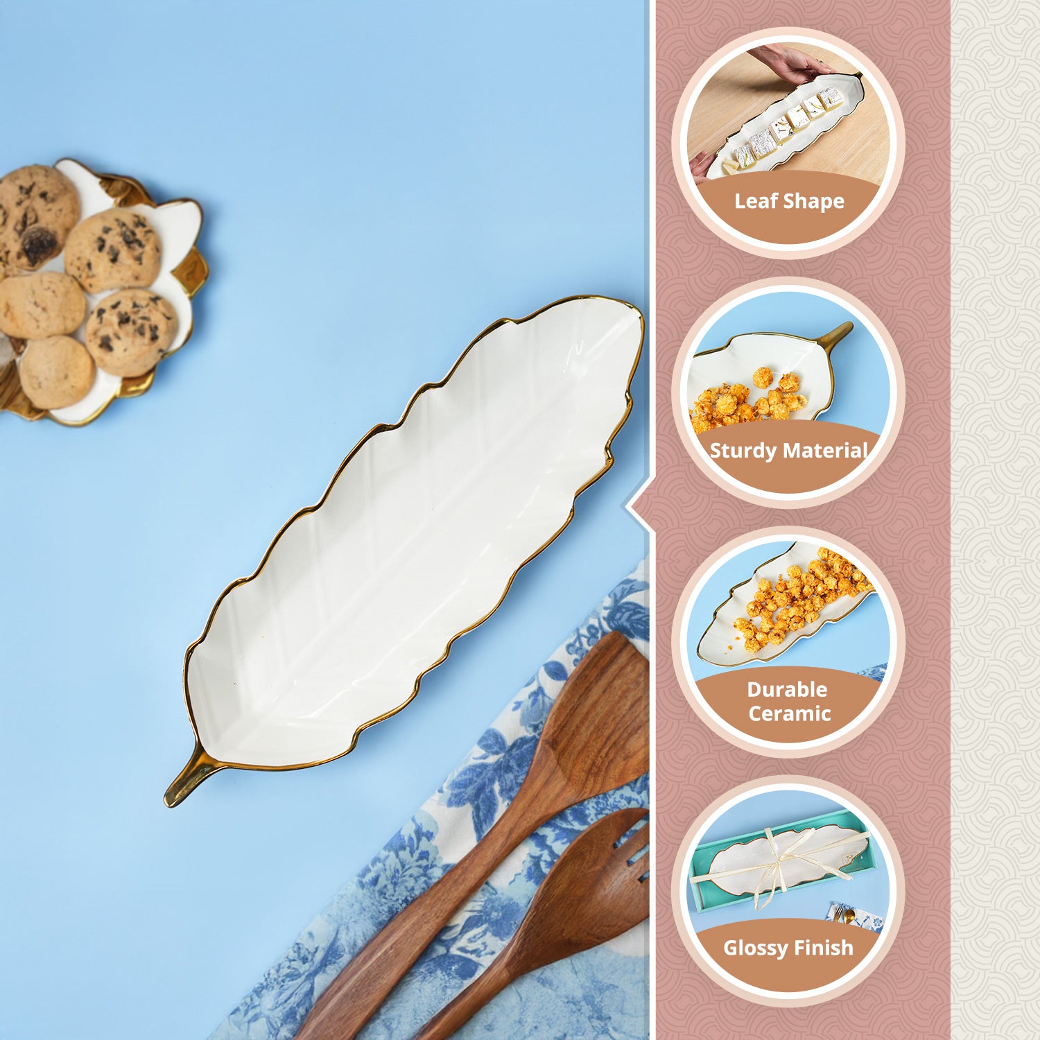 The ceramic leaf dish brings artistic elegance to your serveware collection. Designed in a graceful leaf shape with scalloped edges, it features white ceramic with gold lining that adds charm and refinement. The glossy finish reflects light beautifully, making it an eye-catching piece on any table. Ideal for serving dry fruits, nuts, candies, or small desserts, this dish doubles as a decorative accent when not in use. Its nature-inspired form, combined with luxurious golden detailing, makes it perfect for festive celebrations, gifting, or stylish everyday dining. Lightweight yet durable, it’s a versatile accessory that blends beauty with practicality.