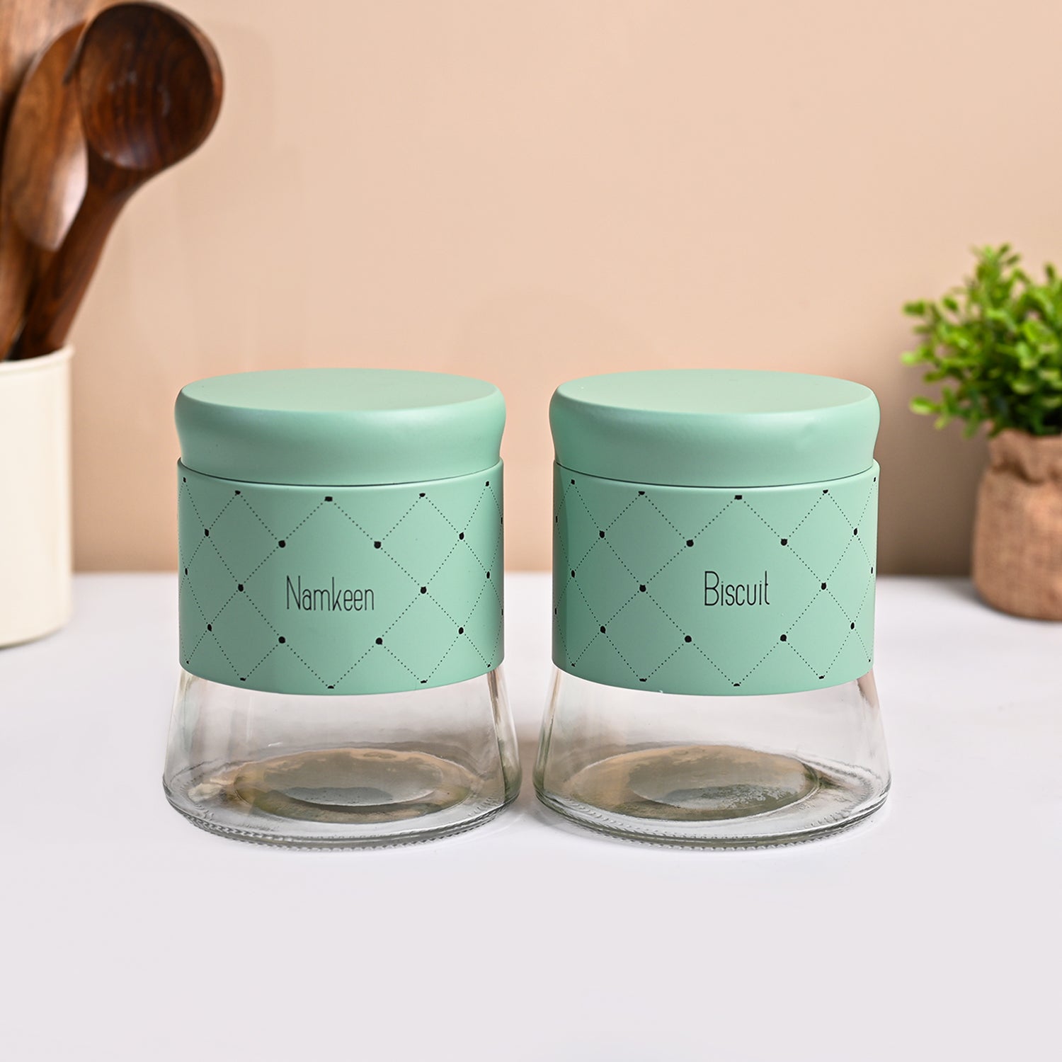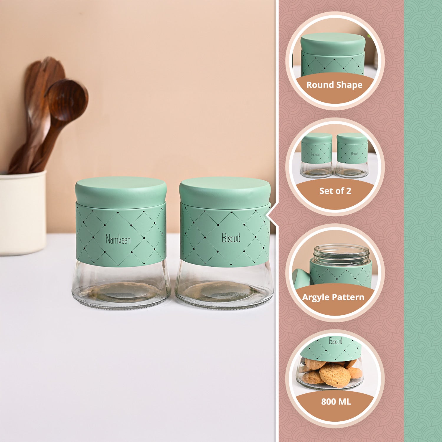 Organize your kitchen with this stylish set of two jars from VON CASA, perfect for storing biscuits and namkeen. These 800 ML round glass jars feature a sophisticated argyle pattern and a beautiful Turquoise matte finish, adding a touch of elegance to your countertop. The jars are designed to keep your snacks fresh and easily accessible. The 11.5 x 11.5 x 13.5 CM dimensions make them an ideal addition to any kitchen or pantry.